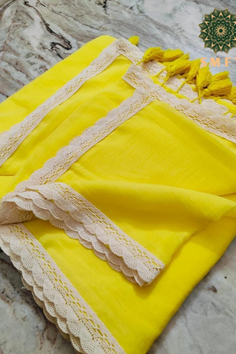 Soft Citrine Plain Pure 100 Count Mulmul Cotton Saree with lace border