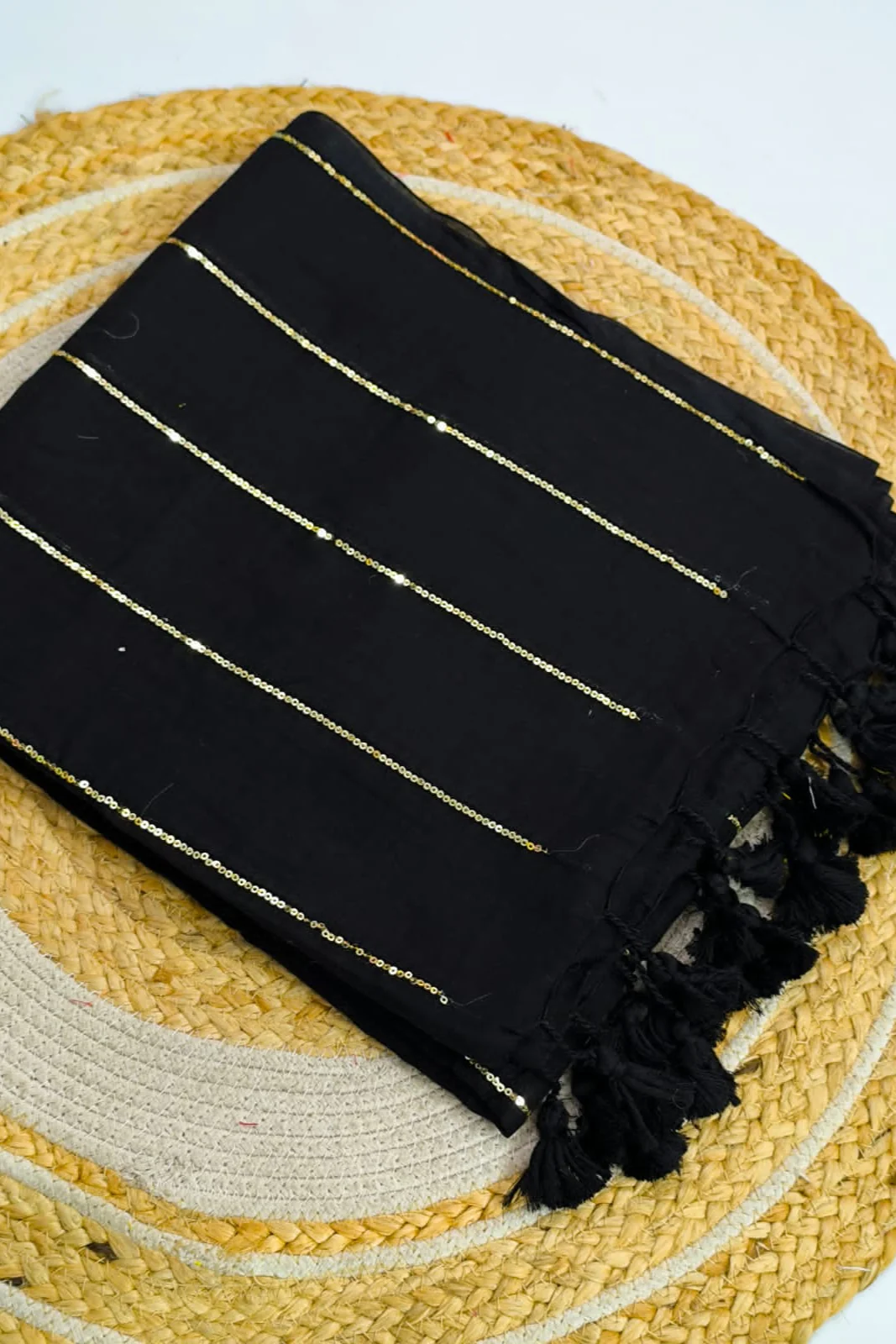 Soft Pure 100 Count Mulmul Eerie Black Sequins Zari Work Cotton Saree
