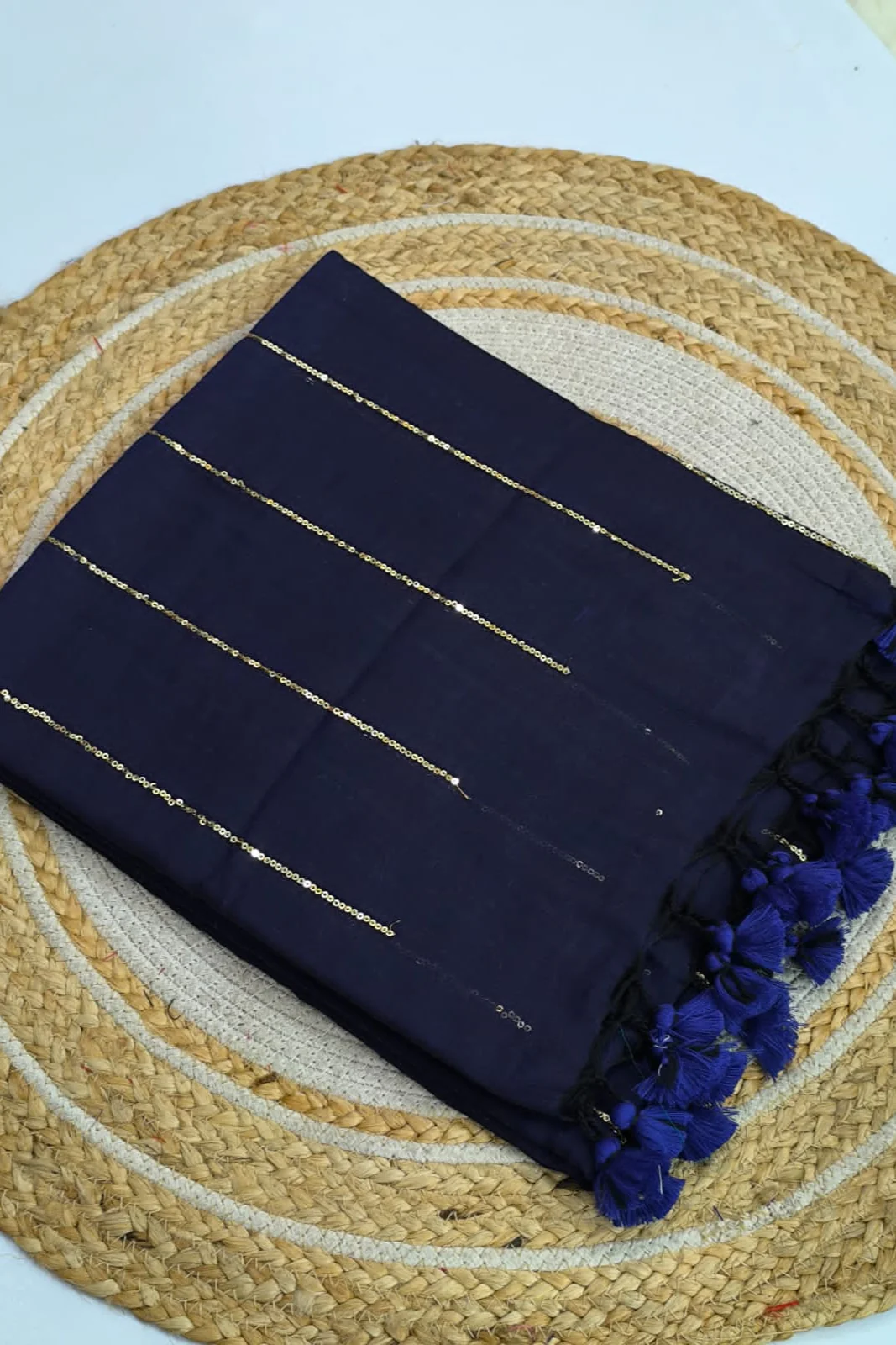 Soft Pure 100 Count Mulmul Yankees Blue Sequins Zari Work Cotton Saree